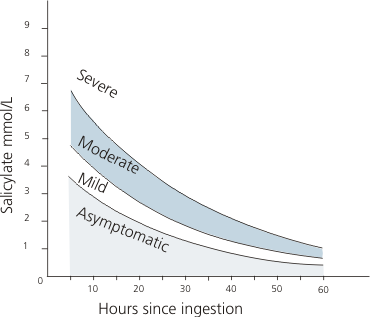 - Blood concentration - nomogram helpful in acute poisoning only. Measure serum salicylate concentration at 6 hours or more post ingestion. Nomogram may dangerously under-estimate toxicity in chronic poisoning if previous salicylate taken within 24 hours, if taken over a prolonged period, or if enteric coated aspirin taken.